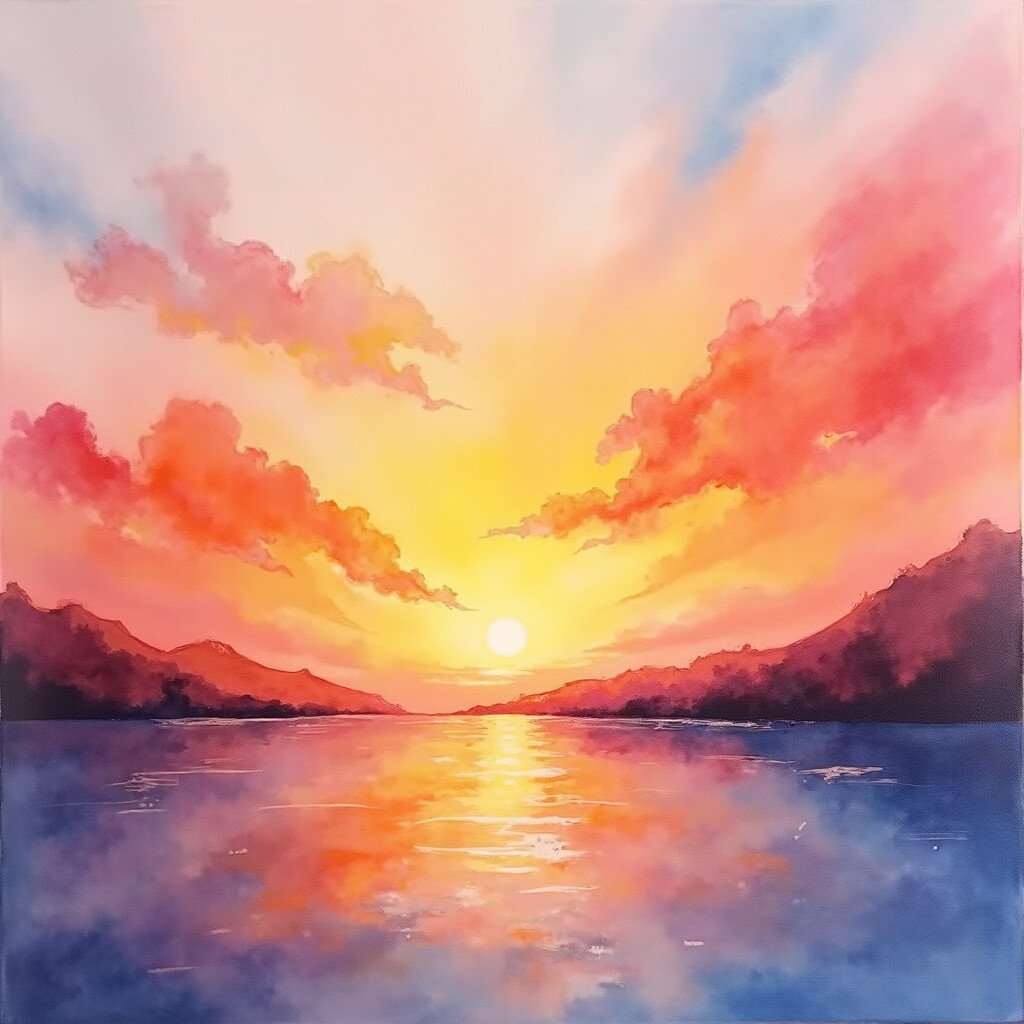 Watercolors can create soft, flowing sunsets. The colors blend beautifully, like a dreamscape on canvas.