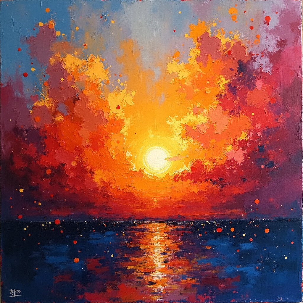 Unleash your inner Jackson Pollock with a splatter sunset. Imagine a canvas where colors burst like fireworks. It’s energetic and full of life.