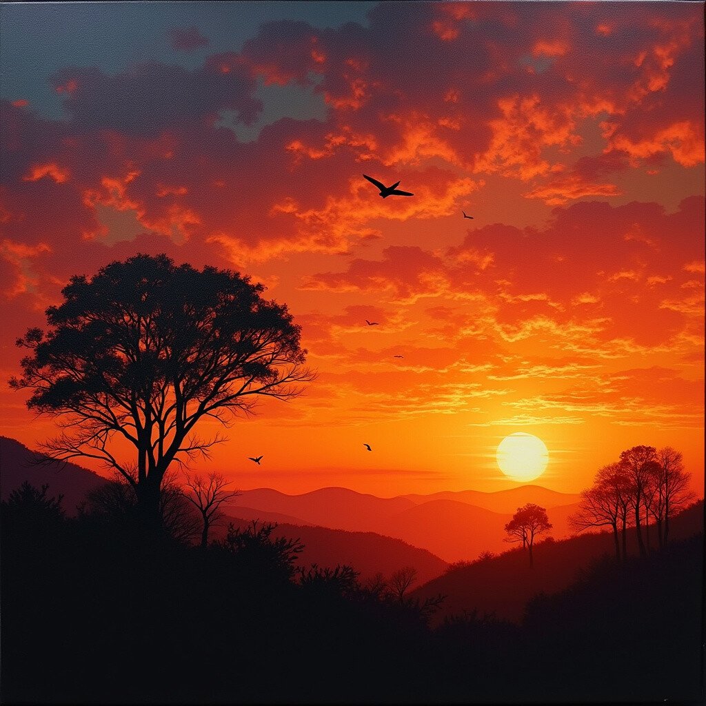 The contrast can make your sunset even more striking, making it a focal point in any room. This style adds mystery and depth to your canvas.