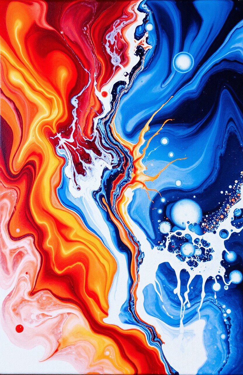 Combine the elements with a fire and ice pour. Use reds, oranges, and yellows for the fire, and contrast them with cool blues and whites.