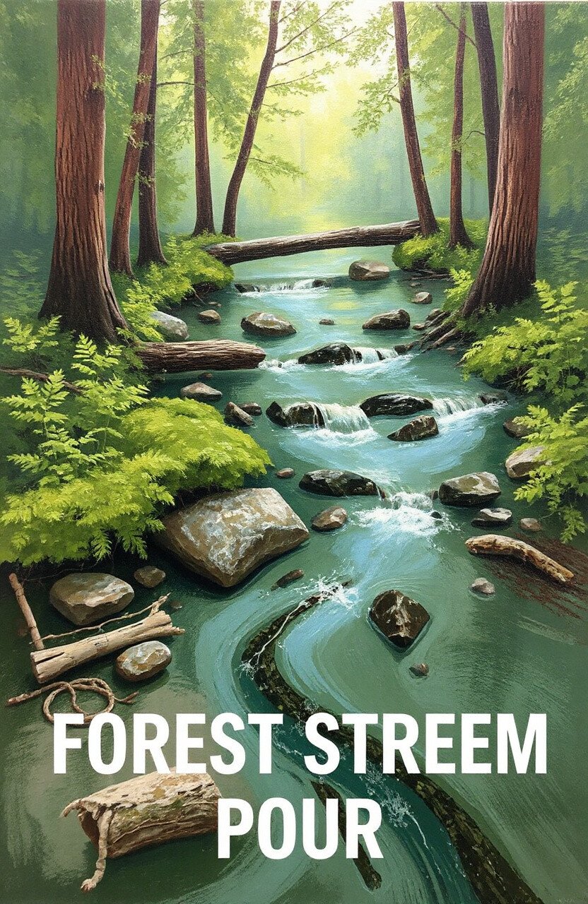 Capture the tranquility of a forest stream with earthy greens, browns, and hints of blue. This piece is a nod to nature’s beauty.