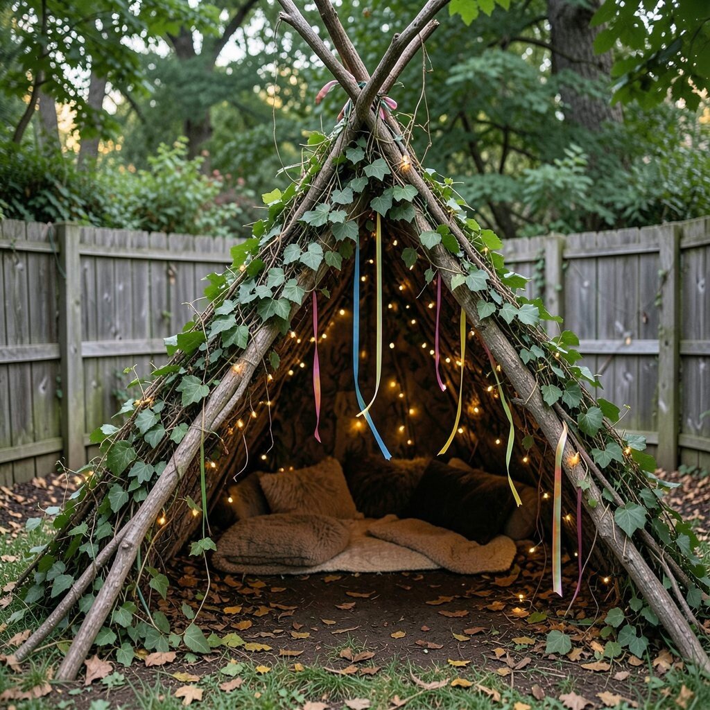 Picture a cozy little hideout made entirely from nature’s bounty. A leafy teepee is both beautiful and practical, providing a shaded spot to hide and relax. It’s like stepping into a woodland fairy tale right in your backyard.