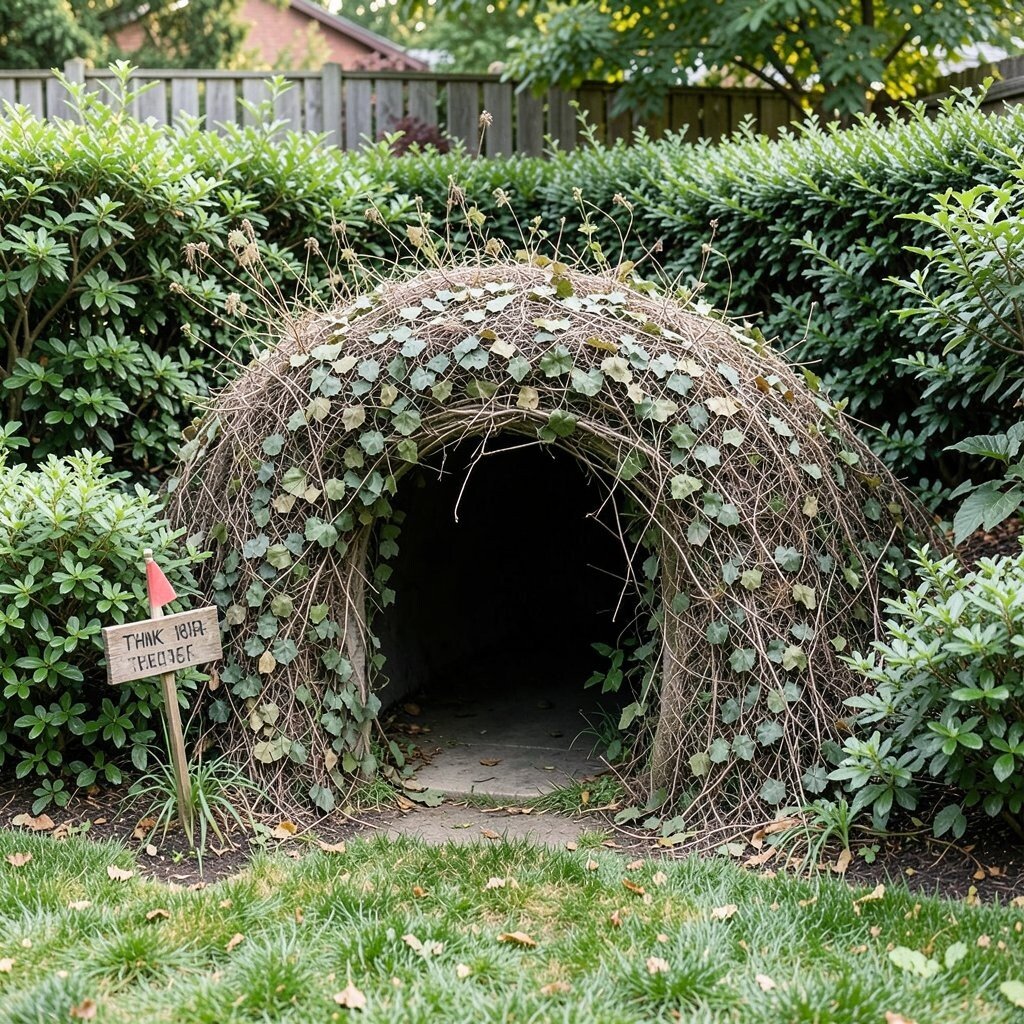 Bushy bunkers are low-cost and can be enhanced with camouflage netting or branches. Personalize with a small flag or a secret sign to mark the entrance. The use of natural elements makes it blend seamlessly into the garden.
