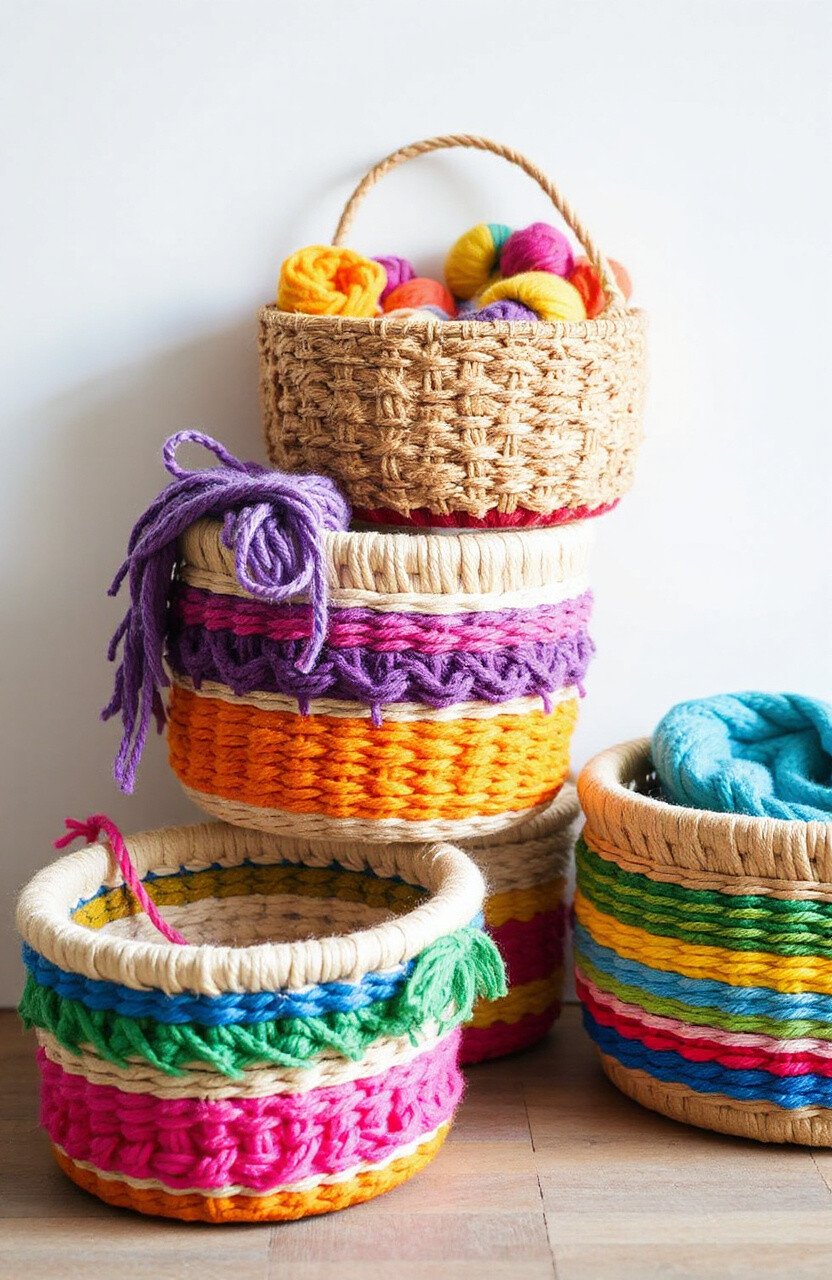 Brighten your space with baskets made from colorful yarn. Mix and match different hues to create a cheerful masterpiece.