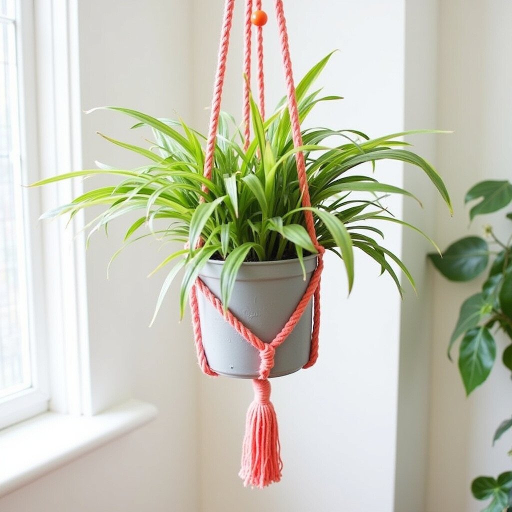 Brighten up your space with plant hangers made from colorful cords. They add a pop of color and can complement any decor style.