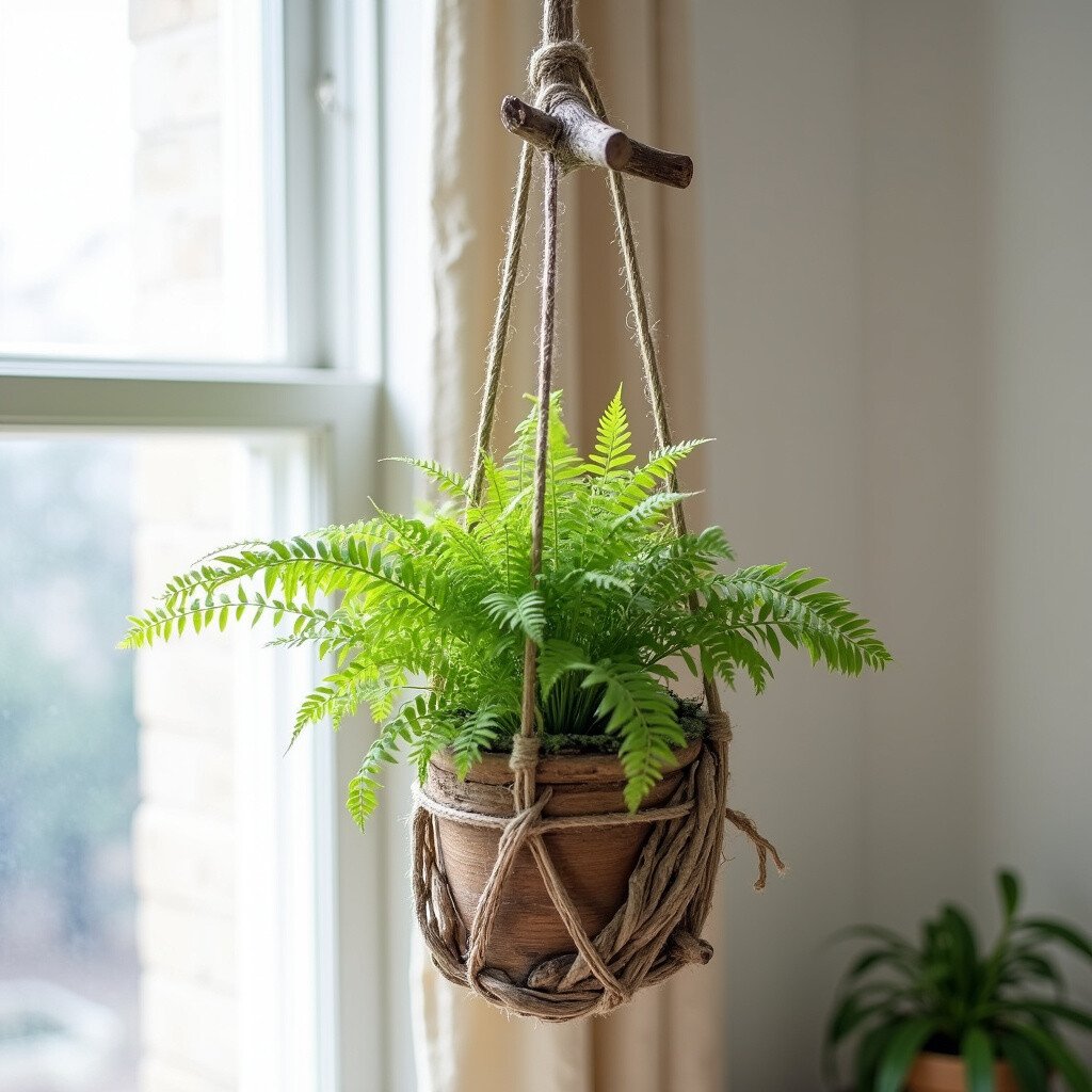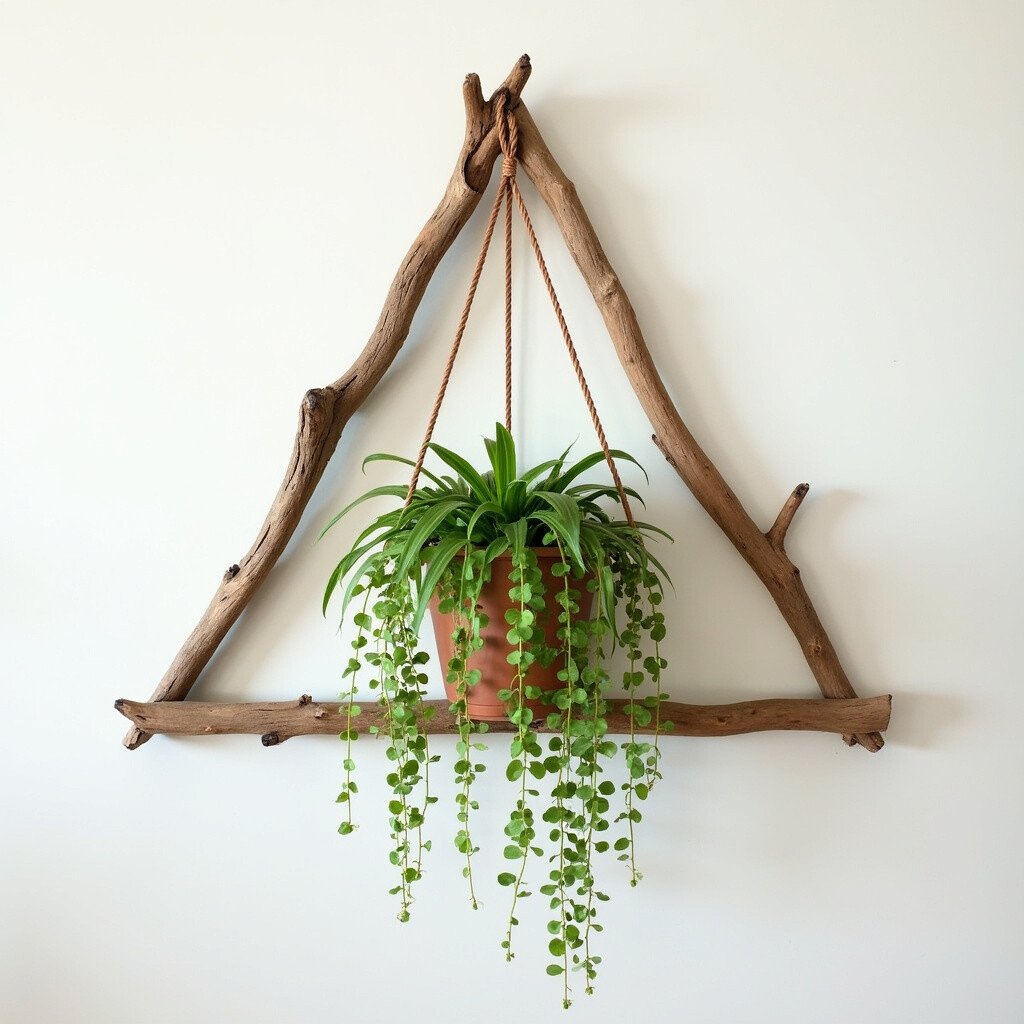 Create a geometric shape with multiple pieces of driftwood, then hang your plant from the center. This artistic approach adds a contemporary edge.