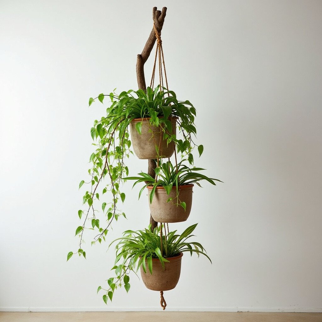 Why hang just one plant when you can have several? A layered driftwood hanger lets you stack multiple pots vertically, creating a lush curtain of greenery.