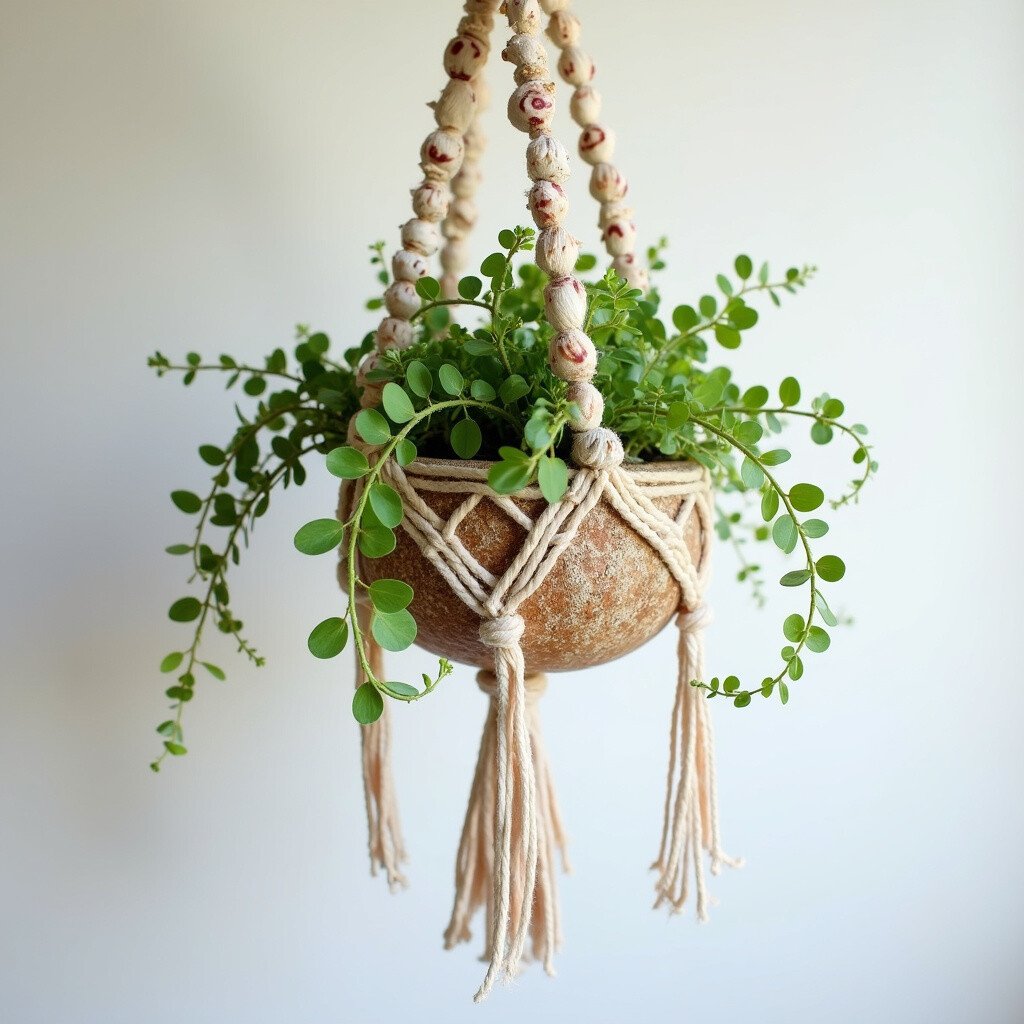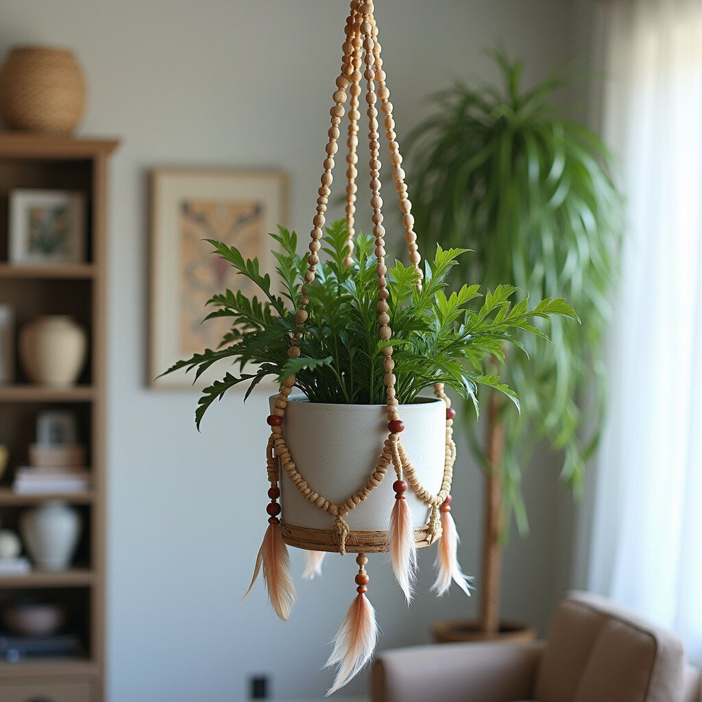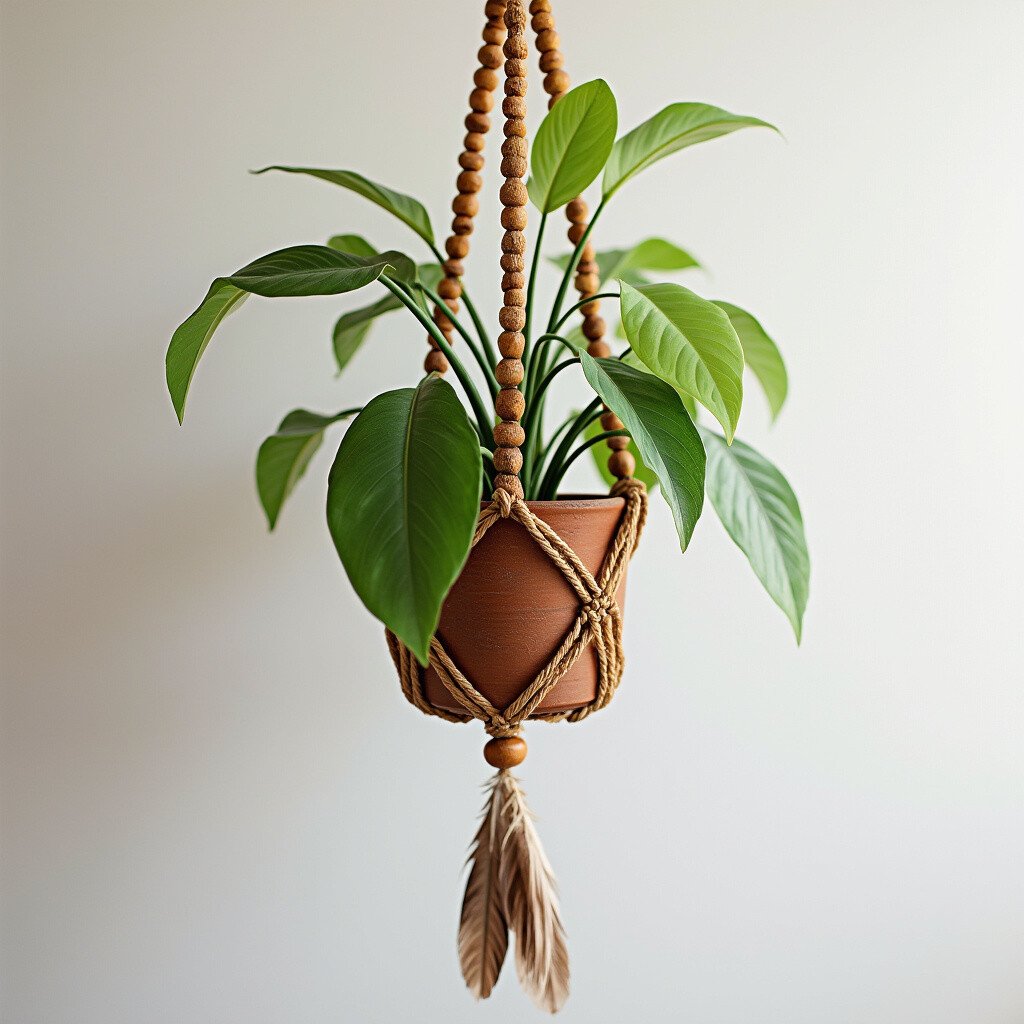 Wooden beads add a rustic, natural touch to your plant hanger design. The warm tones of wood complement the vibrant colors of feathers, creating a balanced and harmonious look.