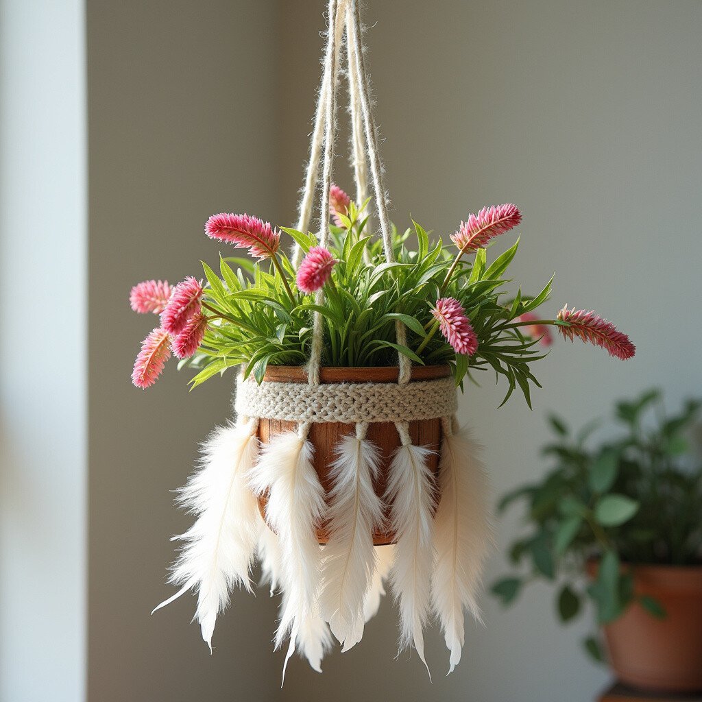 Crochet plant hangers add a touch of handmade charm to your home. The intricate patterns and textures of crochet work beautifully with the soft, flowing lines of feathers.