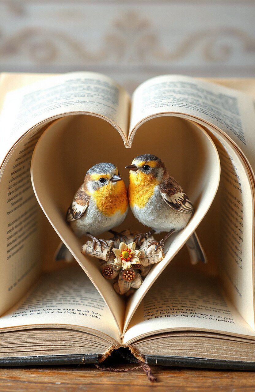 Two birds nestled inside a book create a scene of love and companionship. Perfect for couples. It’s a romantic touch!