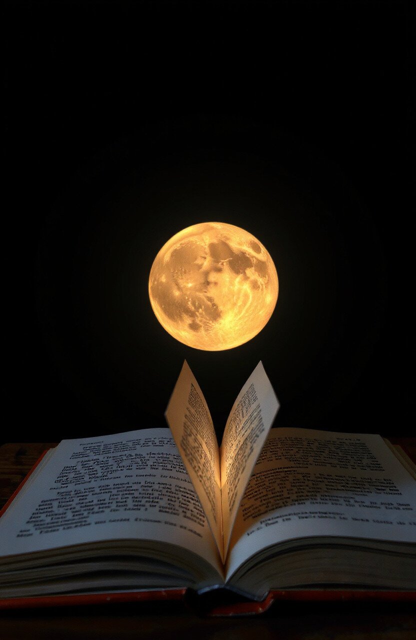 A moon glowing from a book is mystical and serene. Perfect for dreamers and stargazers. It’s a night to remember!