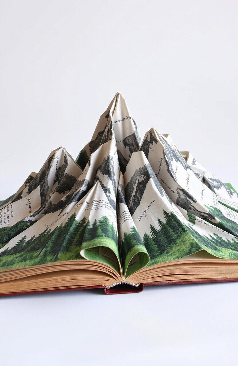 A mountain range folded from book pages is majestic and awe-inspiring. Perfect for nature lovers. It’s a breathtaking view!