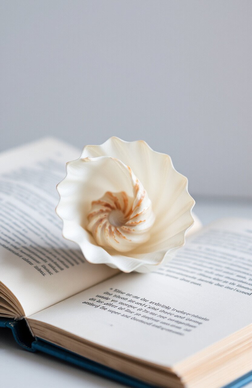 A seashell spiraling from a book is calming and beautiful. Perfect for beach lovers. It’s a serene coastal touch!