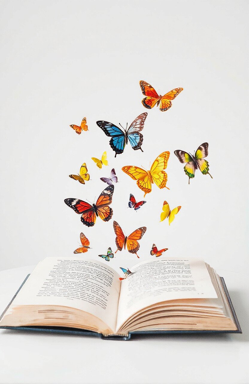 Butterflies fluttering out of a book create a scene of enchantment. It’s like a story coming to life. Great for children’s rooms!