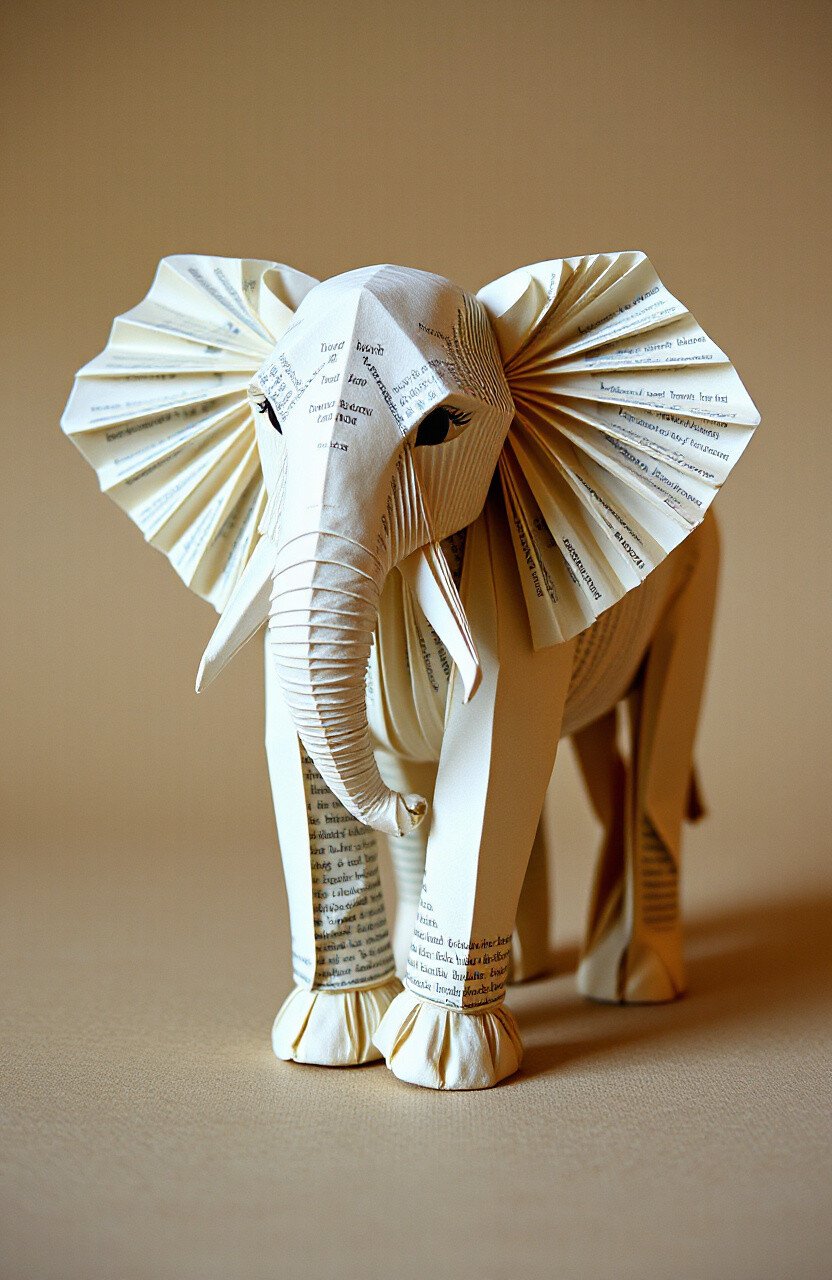 An elephant folded from book pages is grand and graceful. Perfect for animal lovers. It’s a gentle giant!