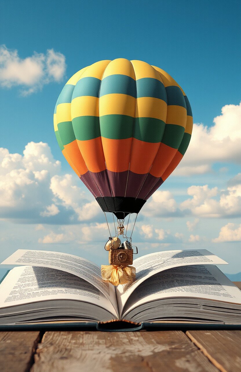 A hot air balloon rising from a book is adventurous and uplifting. Perfect for those who dream of soaring high. It’s a flight of fancy!