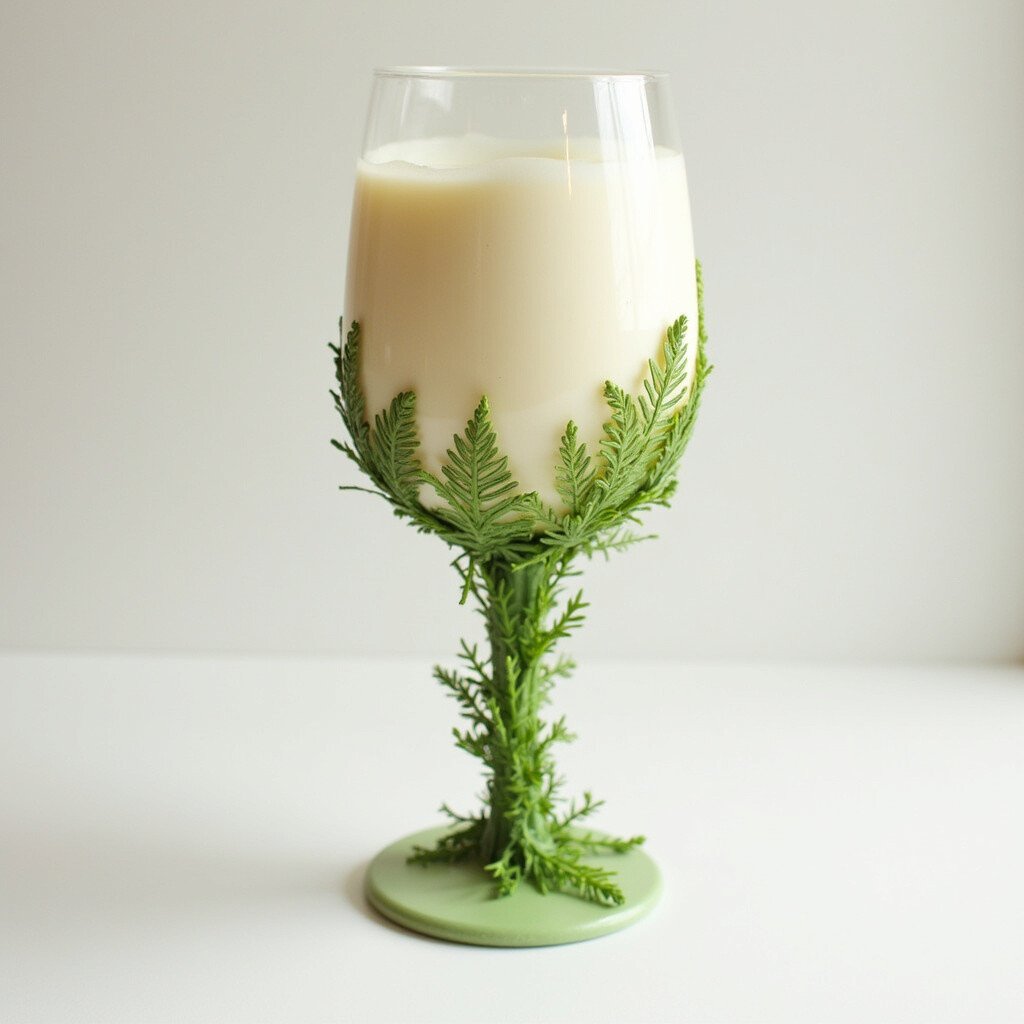 Fern fronds offer a fresh and natural look. Arrange them intricately around the glass base and stem. Their green color contrasts beautifully with a cream-colored paint on the glass.