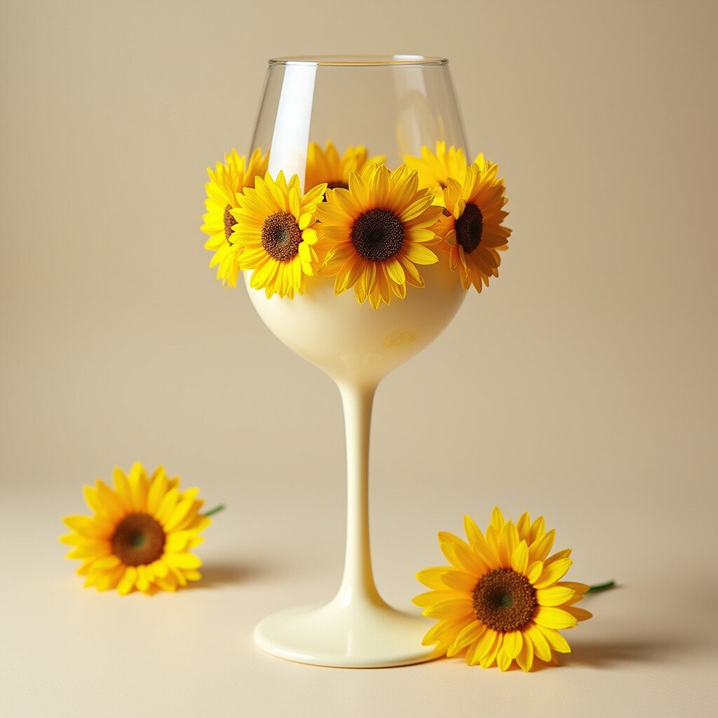 Sunflowers are a symbol of happiness and warmth. Use miniature sunflower heads to decorate the rim and base of the glass. The bright yellow petals paired with cream make for a cheerful design.