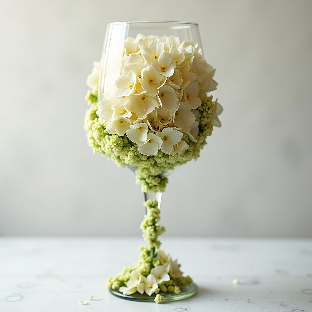 Peonies are lush and voluminous, perfect for creating a luxurious wine glass. Use a few petals to adorn the base and rim for a touch of elegance.