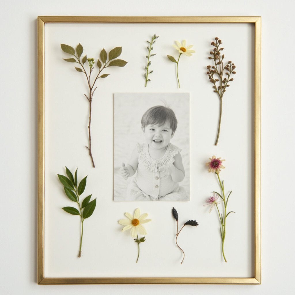 Bring the outdoors inside with a brass frame that features pressed botanical elements. It’s a fresh, nature-inspired way to decorate your home. Picture a delicate leaf or flower pressed alongside a cherished photo.