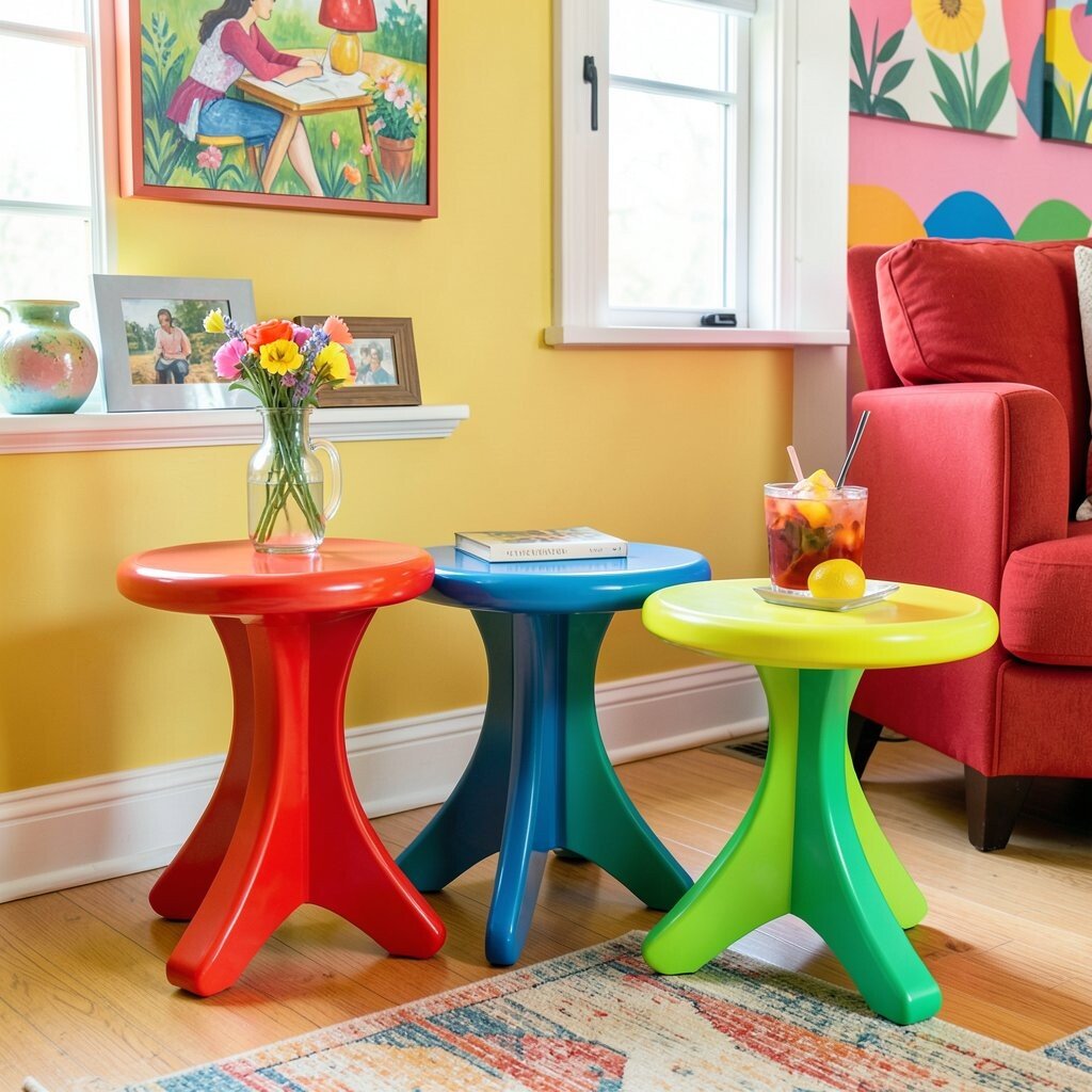 End tables don’t just hold drinks; they can be a fun way to add color to your space. Look for ones with unusual shapes or bright hues.