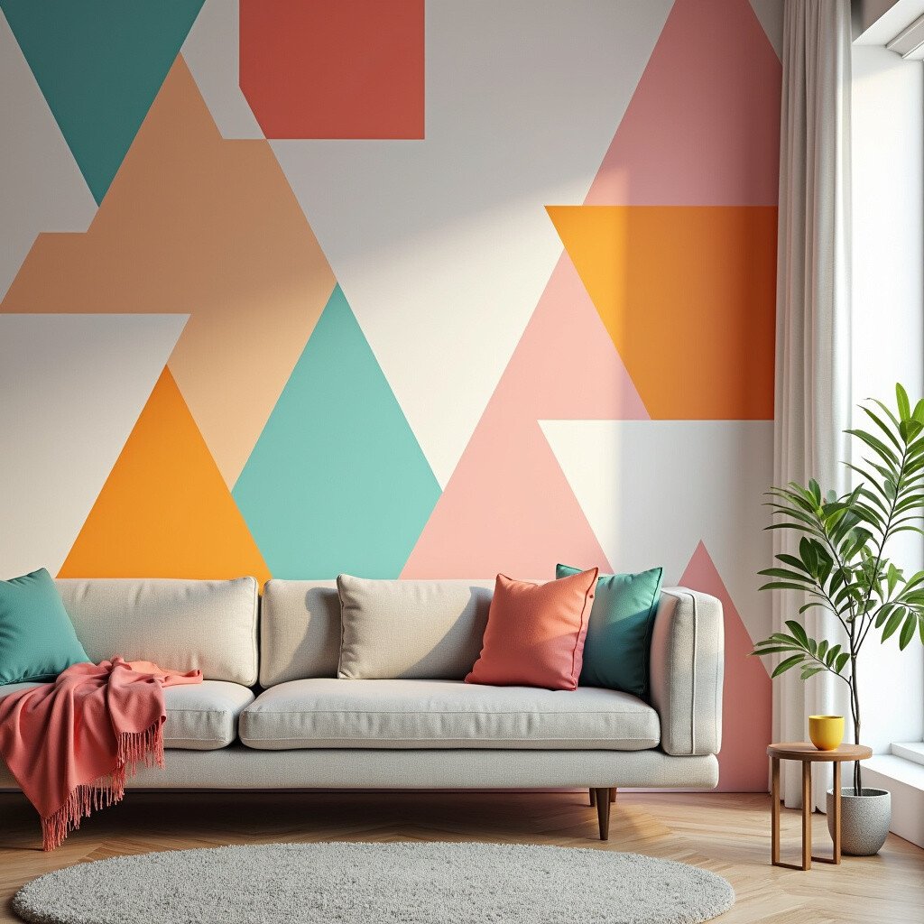 Geometric patterns bring a modern and artistic touch to any space. Use painter’s tape to create triangles, squares, or hexagons, and fill them with bold colors like teal, orange, or magenta.