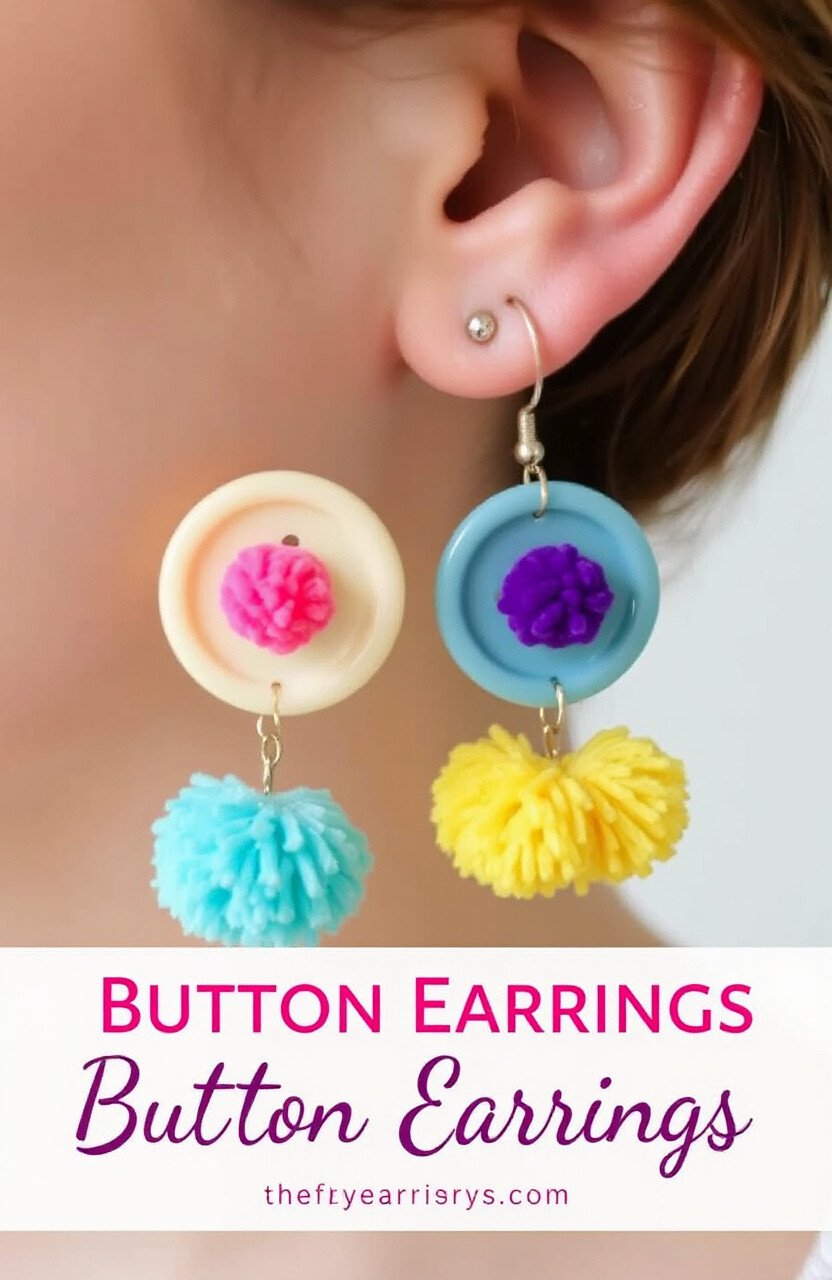 Attach small pom-poms to your buttons in matching or contrasting colors. This is an easy, budget-friendly project that adds a fun element to your style. These earrings are perfect for adding a bit of cheer to your day.