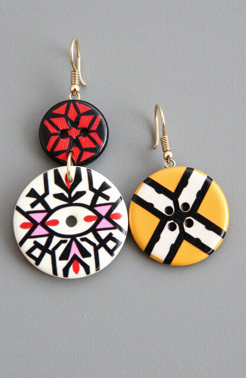 Use paint or fabric with geometric patterns to decorate your buttons. This is a project that allows you to play with shapes and lines. These earrings are a striking addition to any outfit.
