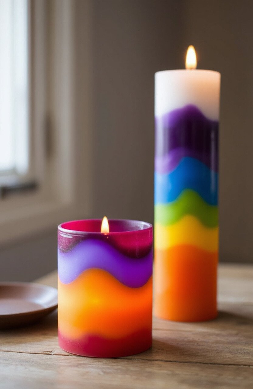 Layered color candles are like a rainbow in wax form. Pour different colored wax in layers to create a gradient effect. It’s like having a piece of the sunset in your room!