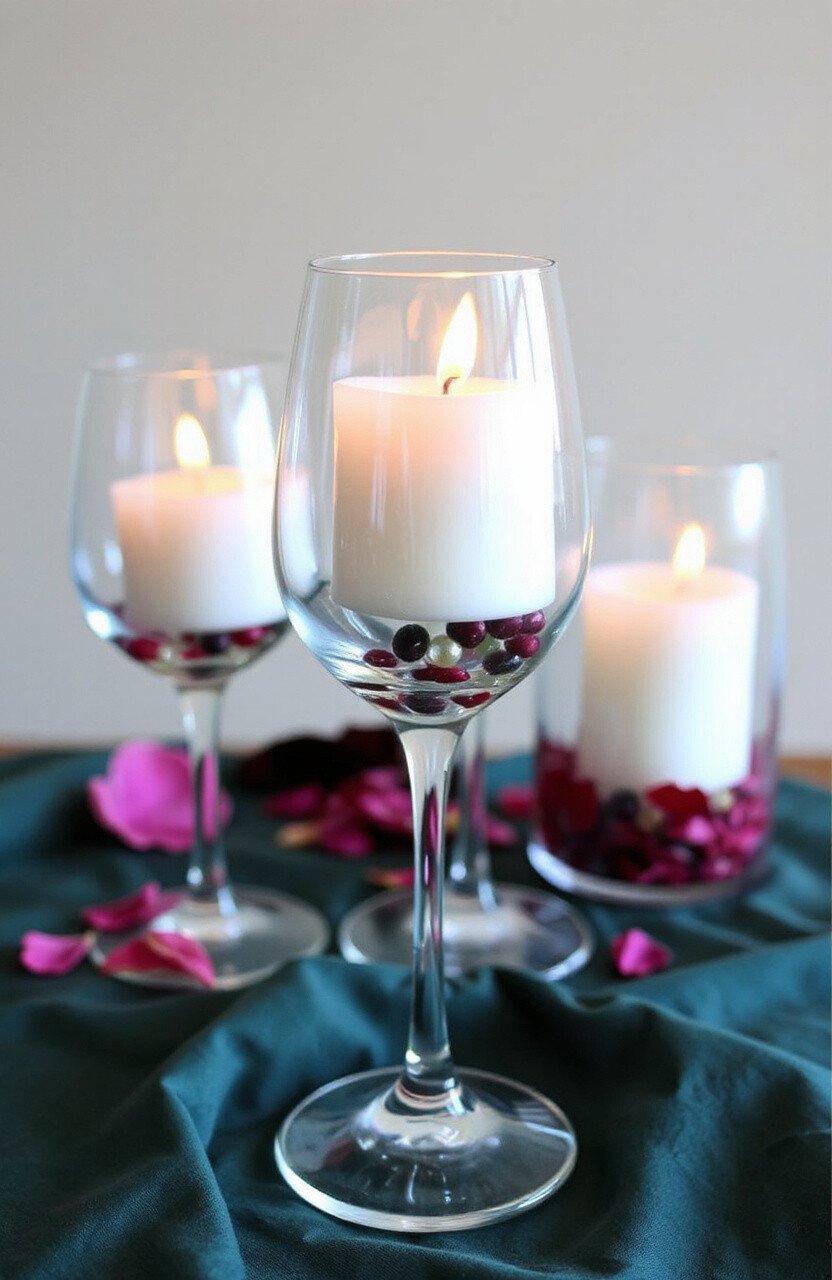 Turn wine glasses into elegant candles. This idea is perfect for dinner parties or a romantic setting.