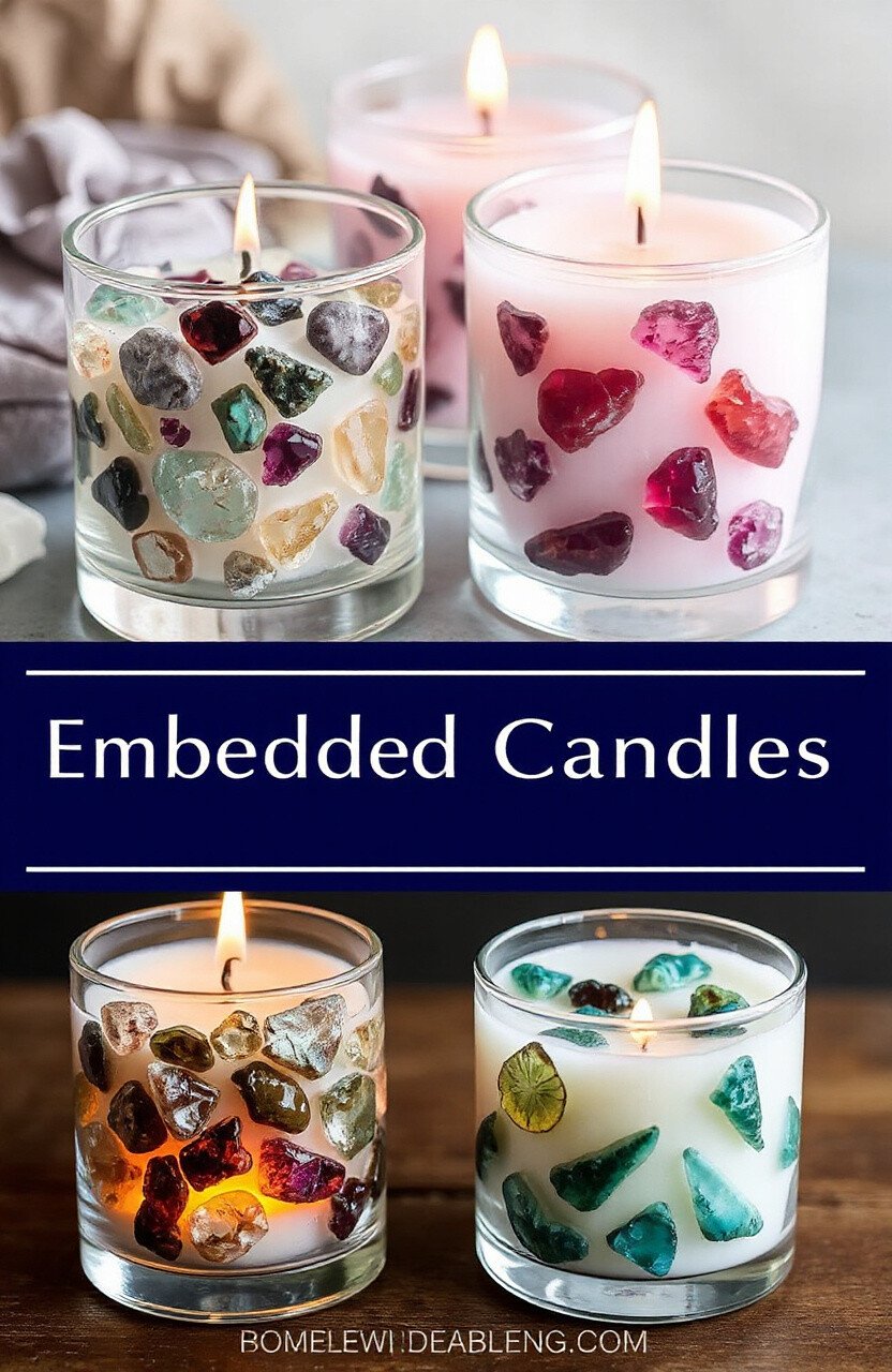 Capture the beauty of gemstones by embedding them in your candles. Use clear wax to showcase their colors and shapes.