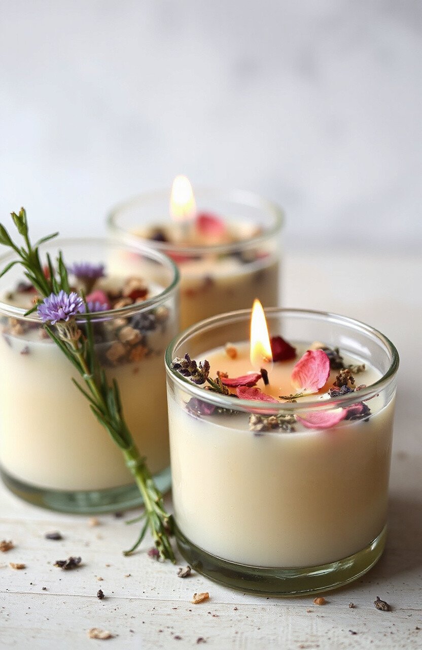 Infuse your candles with the beauty of nature by adding dried flowers and herbs. Picture lavender, rose petals, or even rosemary peeking through the wax. This not only gives a rustic charm but also adds a gentle fragrance.