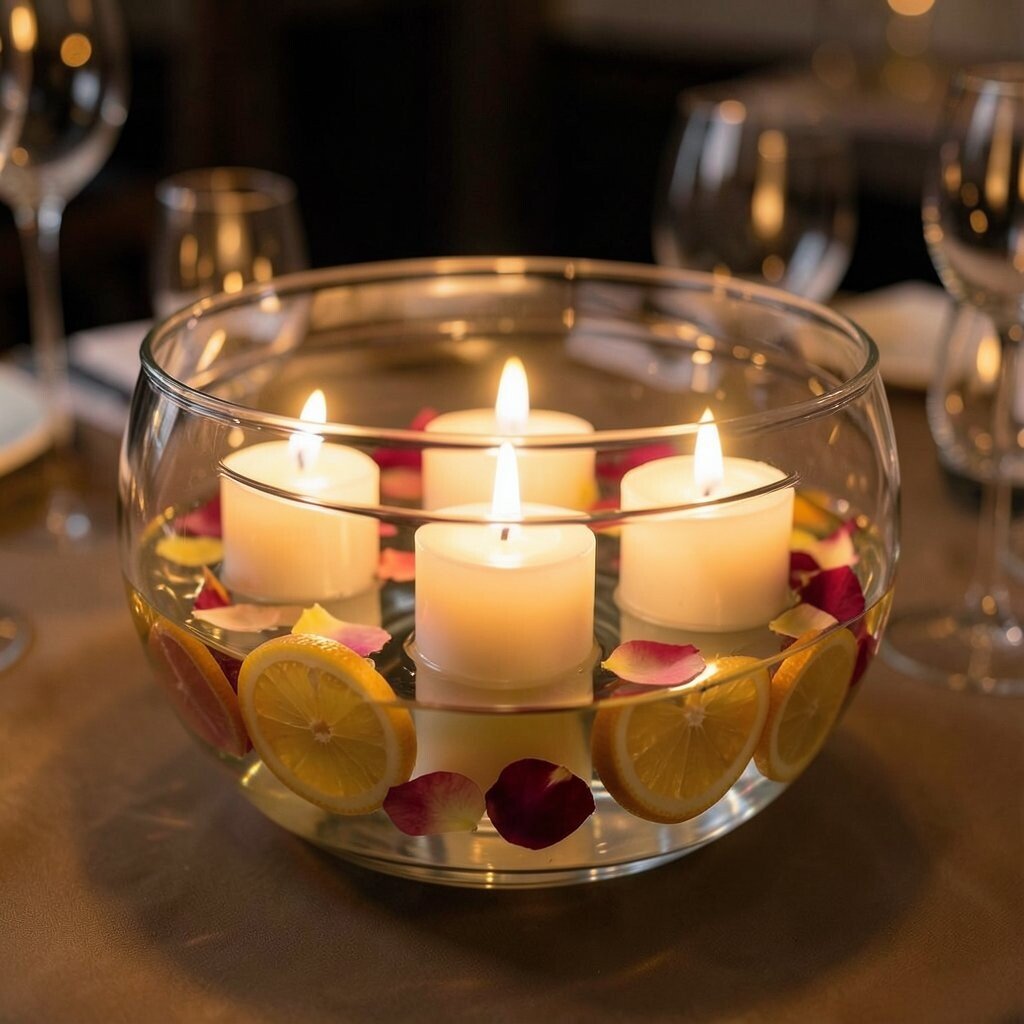 Floating candles in a clear glass bowl add an instant touch of elegance. Imagine soft flickering lights dancing on water, creating a magical ambiance. This idea is both sophisticated and serene, ideal for evening dinners.