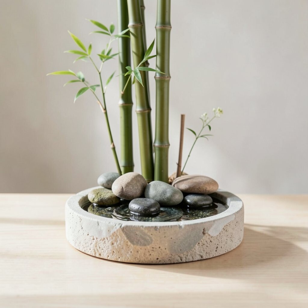 For a calming centerpiece, go for a minimalist zen arrangement. Use stones, bamboo, and a small water feature for a peaceful vibe. This setup is perfect for those who prefer simplicity and tranquility.