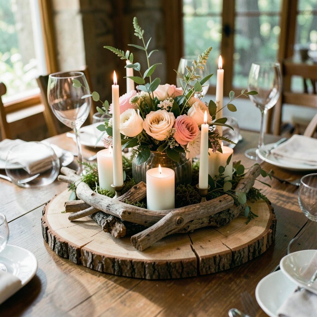 Bring a touch of the forest to your table with natural wood elements. Use wooden slices, branches, or driftwood as the base for your centerpiece. Add candles, flowers, or greenery for a rustic feel.