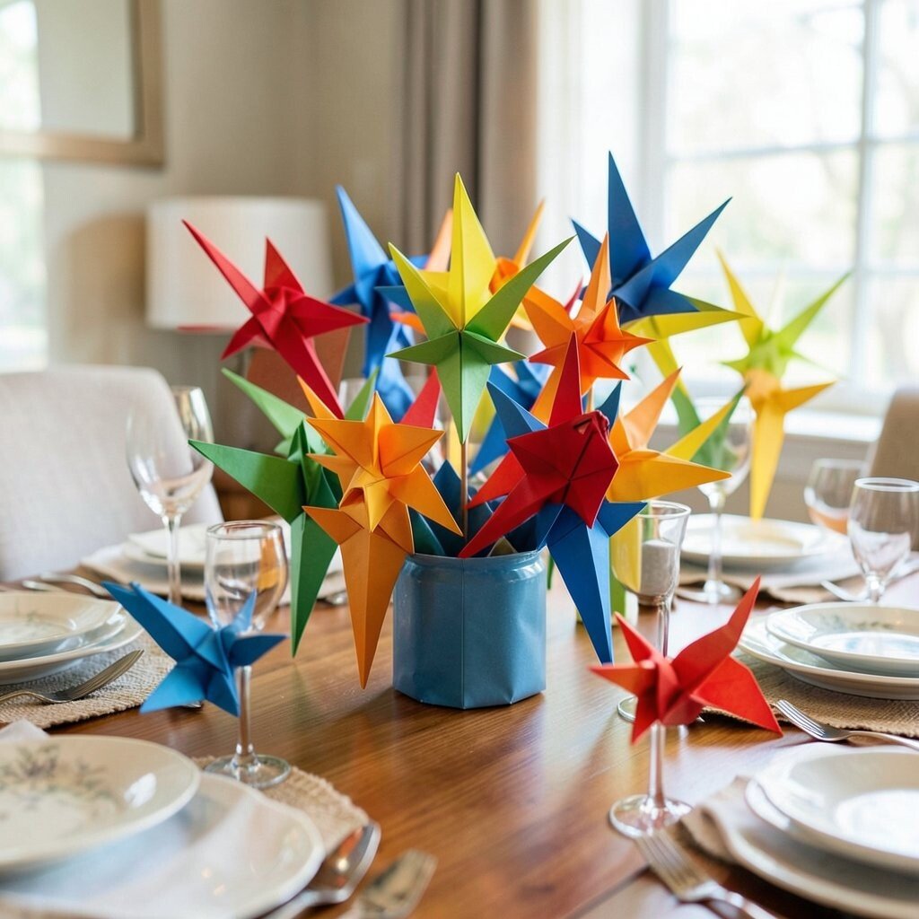 Origami isn’t just for paper cranes—it can be a beautiful centerpiece too! Arrange different origami figures in bold colors and shapes for a playful display. This idea adds a touch of fun and creativity to your table.