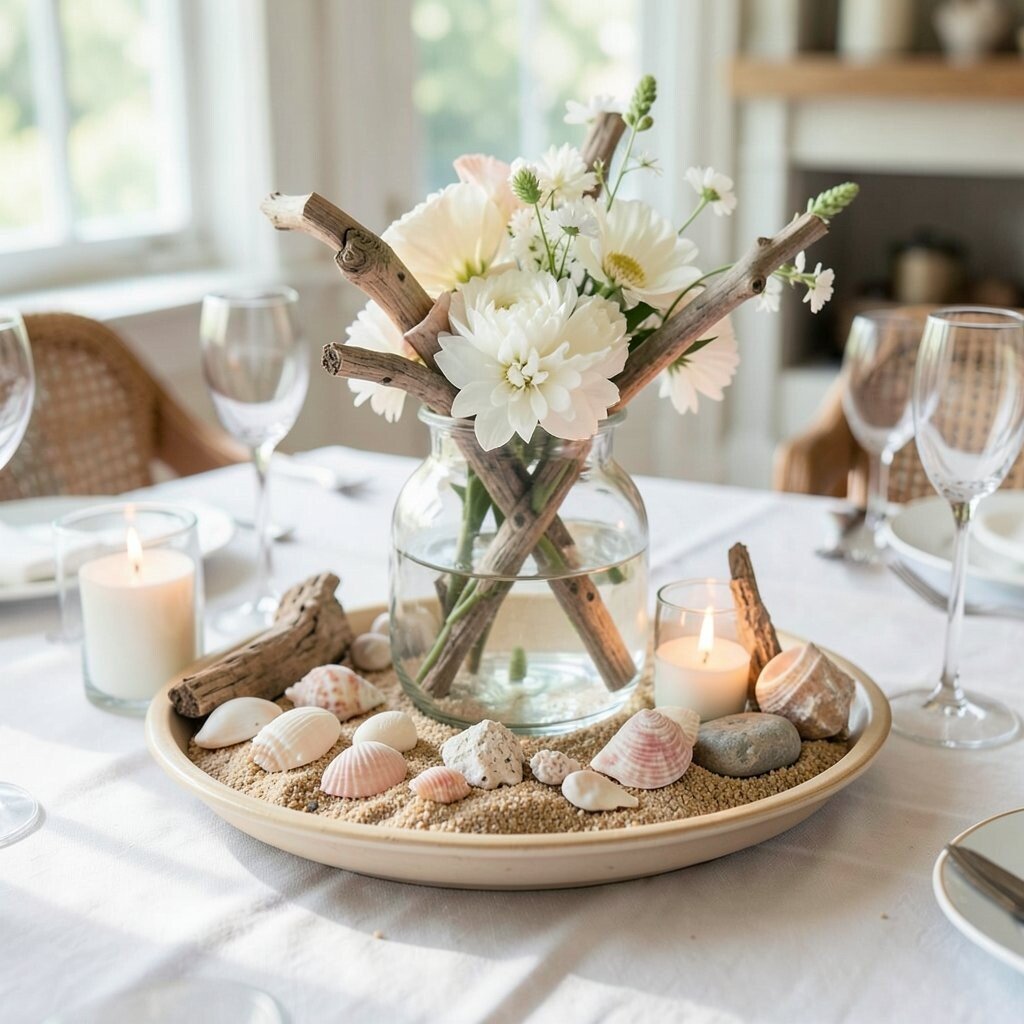 Bring the beach to your table with a centerpiece of seashells and sand. Use a shallow tray or a large glass vase to hold your beach treasures. This is a great way to relive summer memories and create a calming, coastal atmosphere.
