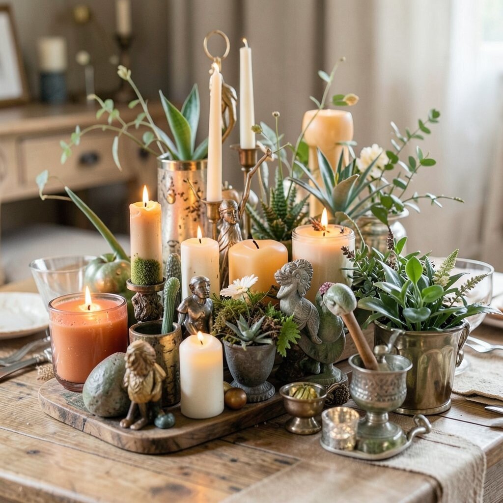Why stick to one theme when you can have them all? An eclectic mix of items like candles, small sculptures, and plants can make a striking centerpiece. This idea is perfect for those who love diverse styles.