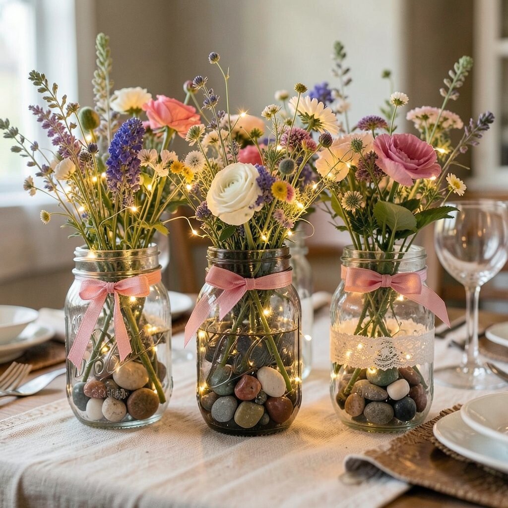One of the best things about mason jar centerpieces is their affordability. You can personalize them with ribbons, lace, or even paint for a pop of color. A cluster of these on your table can bring warmth and charm without breaking the bank.