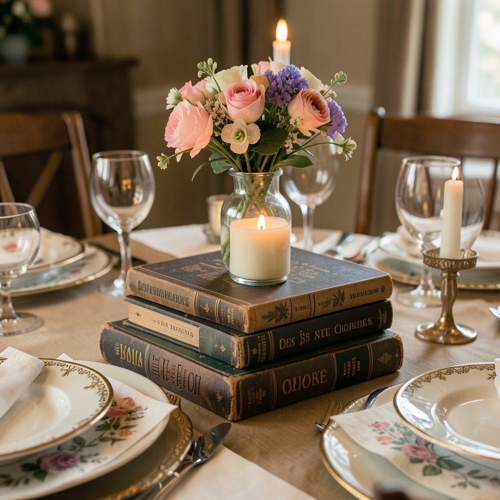 For a touch of literary charm, stack some vintage books at the center of your table. Top them with a small vase of flowers or a candle for added elegance. This idea is perfect for book lovers and adds a cozy, intellectual vibe.