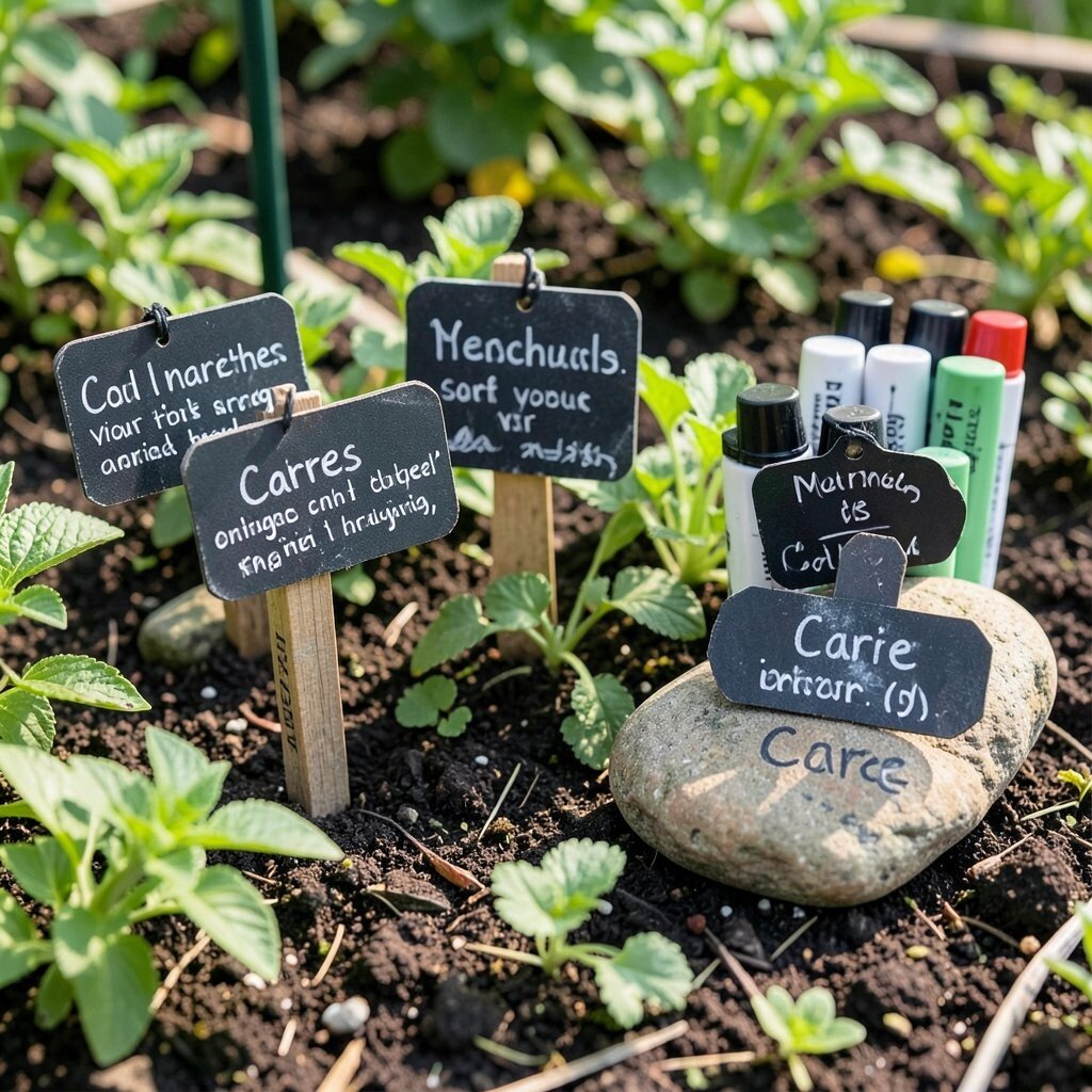 Label plants in your garden with chalk marker signs. Write the names and care instructions on reusable tags or stones.