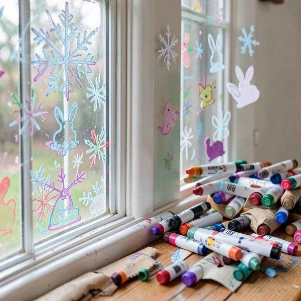 Decorate your windows with seasonal designs using chalk markers. From snowflakes to bunnies, these decorations can be easily wiped away when the season changes.