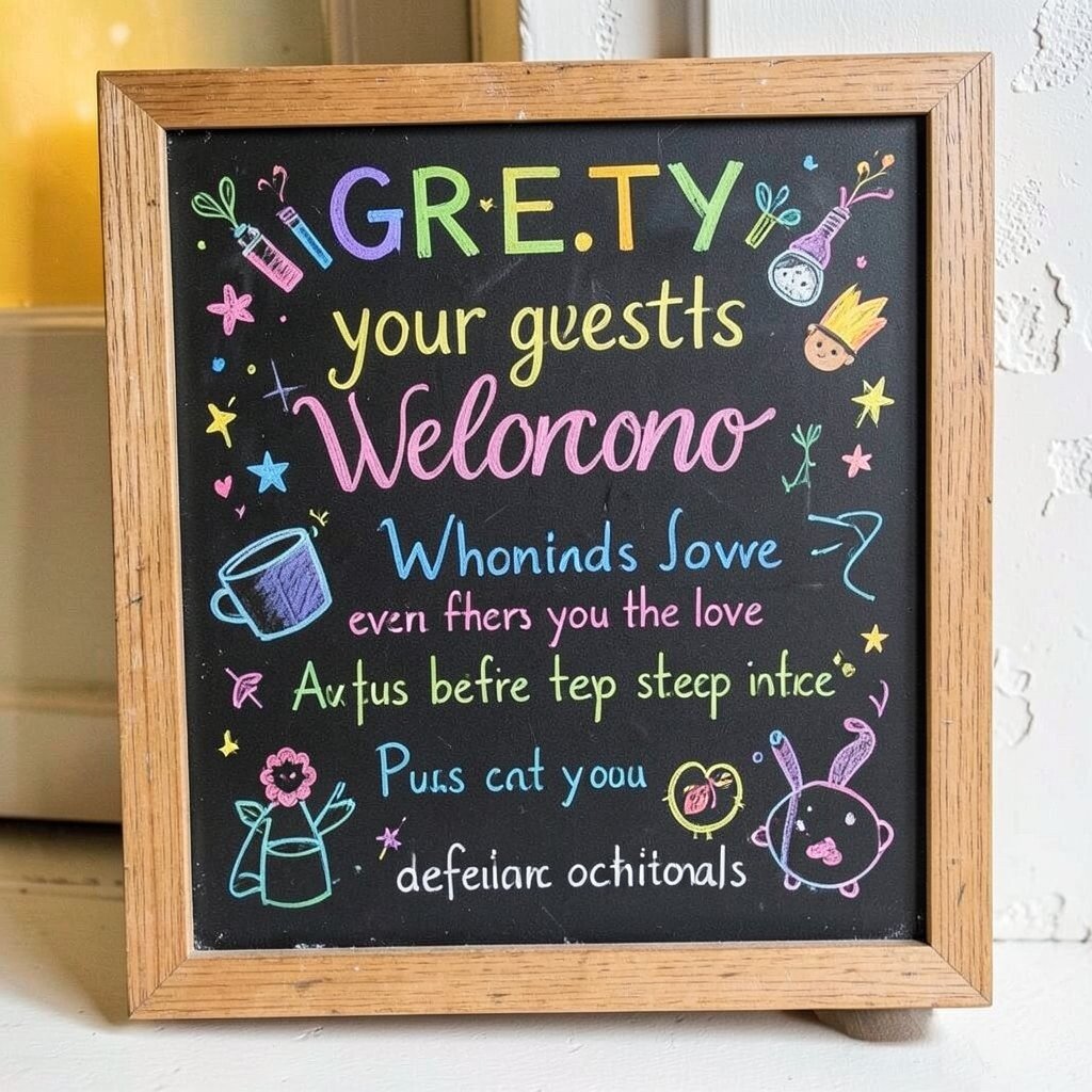 Greet your guests with a personalized welcome message on a chalkboard sign. Use bright colors to make your message pop. It’s a warm, inviting way to say “hello” before you even open the door.