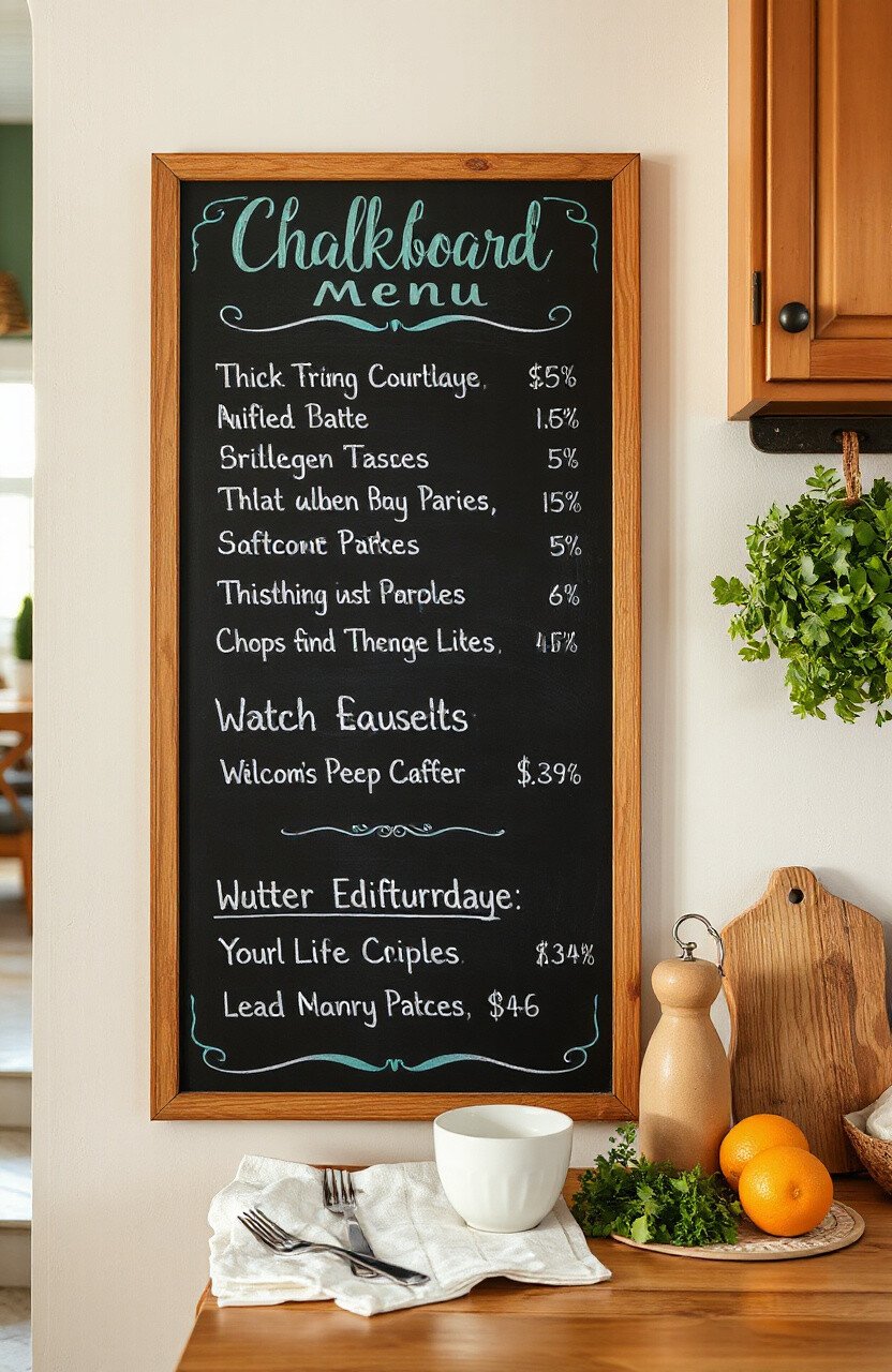 Display your favorite recipes on a chalkboard for a charming kitchen feature. It’s a practical and stylish way to share beloved dishes. Update it with seasonal recipes or family favorites.