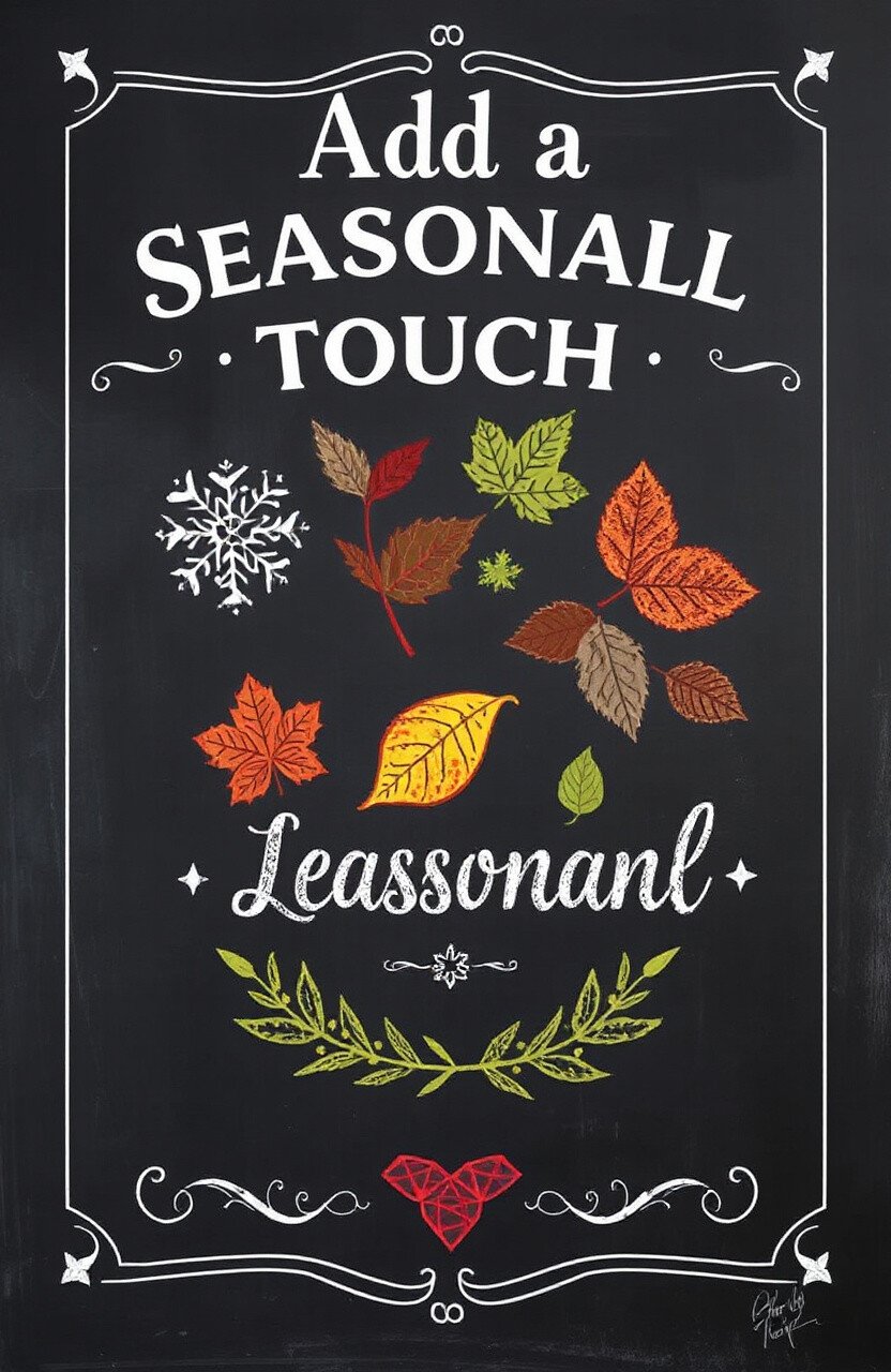 Change your chalkboard design with the seasons to keep things fresh. Use seasonal colors, motifs, and themes to reflect the time of year. This keeps your decor dynamic and interesting.