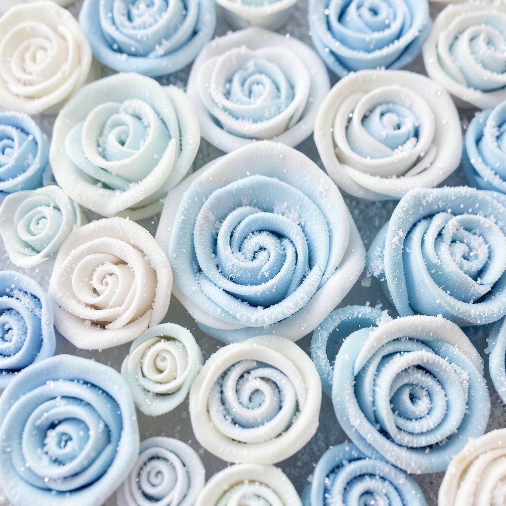 Whites and icy blues create a winter wonderland effect. Ideal for holiday crafts or winter weddings.