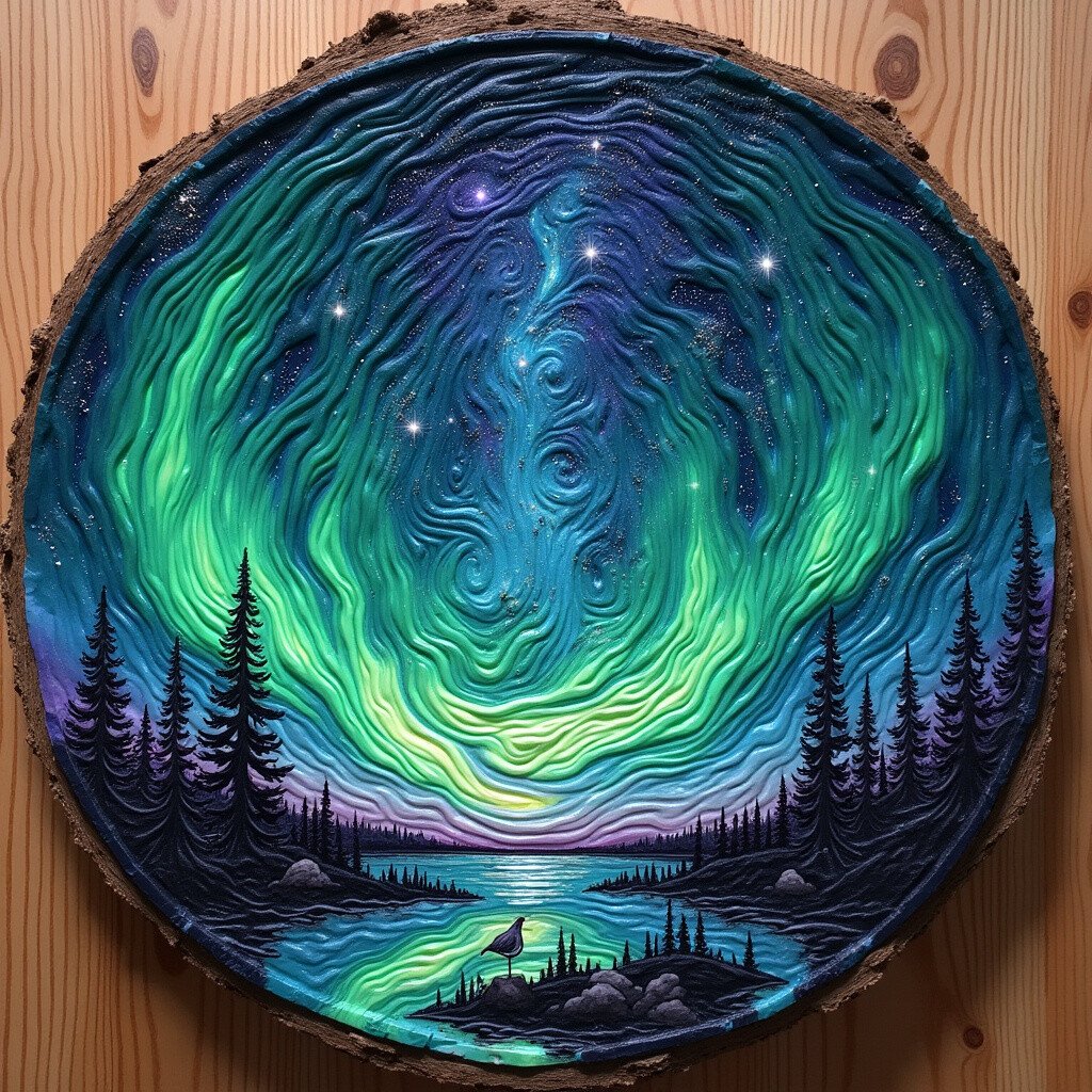 The swirling coils of green, purple, and blue mimic the dancing lights, offering a touch of wonder to any room.