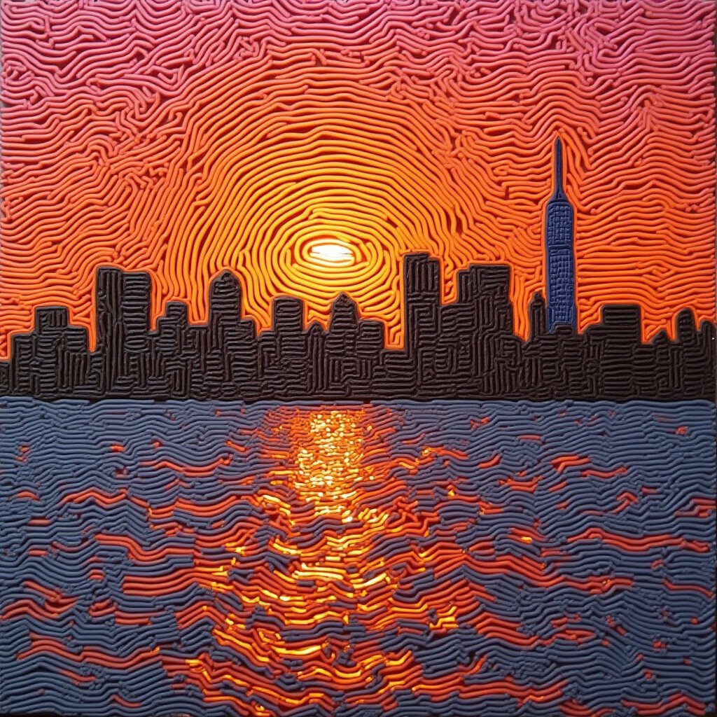 The vibrant coils of orange and pink create a stunning contrast against the silhouette of the city, capturing the bustling energy of urban life.