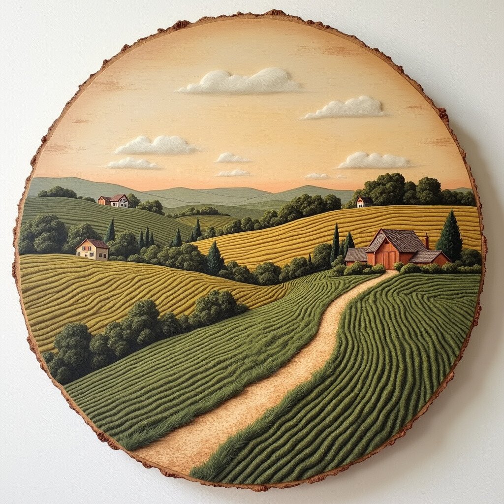 This artwork depicts a serene countryside with rolling hills and quaint farmhouses. It’s perfect for bringing a slice of country life to your urban dwelling.