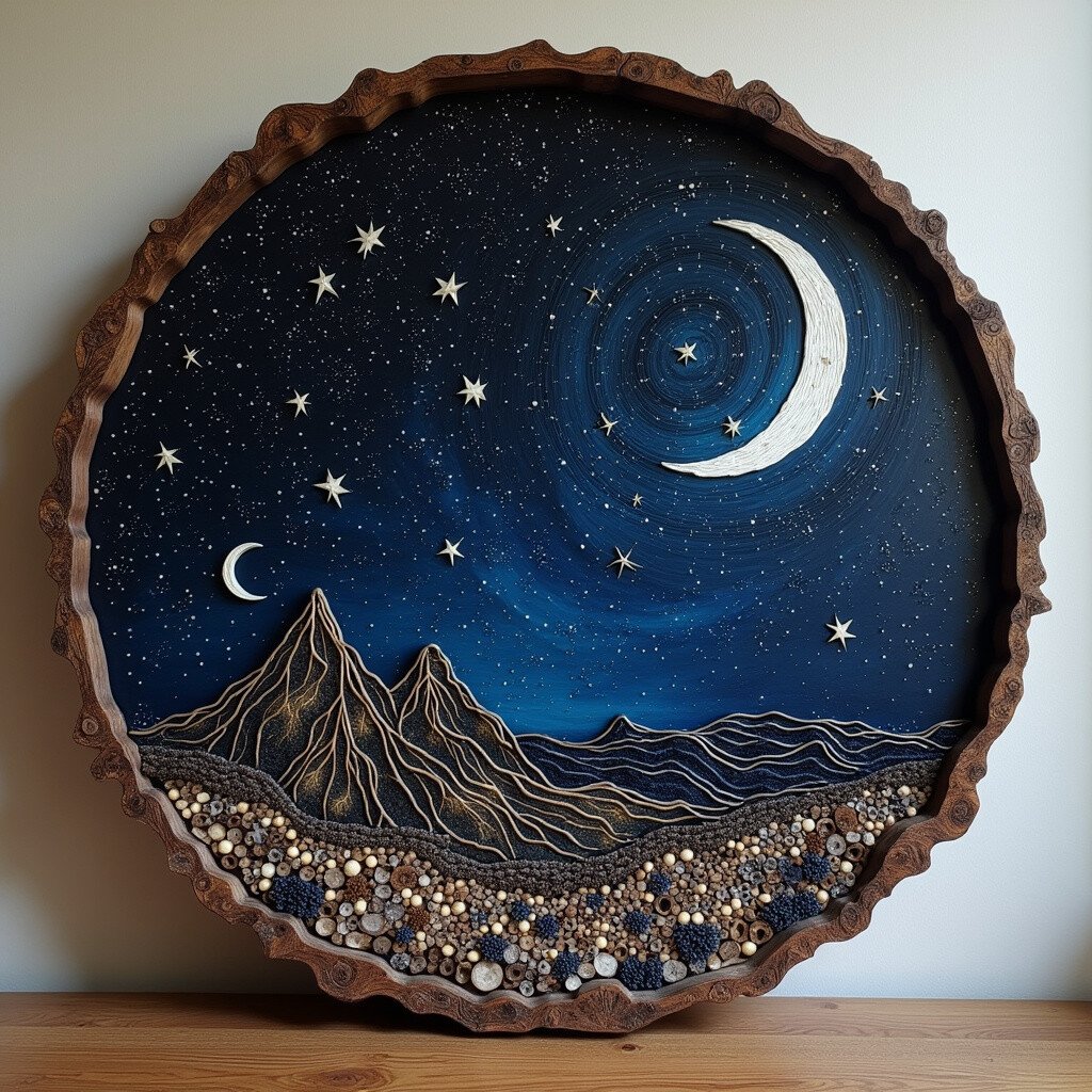 Experience the magic of the night with coiled stars and a crescent moon. This piece is perfect for a bedroom or meditation space.